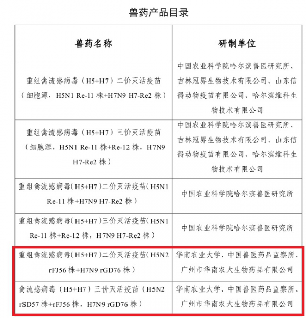 熱烈祝賀華南農業大學、中國獸醫藥品監察所與廣州市華南農大生物藥品有限公司聯合研制的重組禽流感病毒(H5+H7)二價滅活疫苗(H5N2 rFJ56株+H7N9 rGD76株)和重組禽流感病毒(H5+H7)三價滅活疫苗(H5N2 rSD57株+rFJ56株,H7N9 rGD76株)兩個產品通過農業農村部新獸藥評價!!!