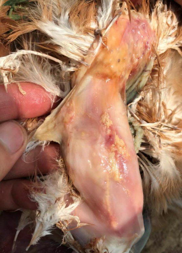 注(zhu)射(she)(she)油(you)苗(miao)時將油(you)苗(miao)注(zhu)射(she)(she)到(dao)頸(jing)部(bu)肌(ji)肉內,可造(zao)成頸(jing)部(bu)腫脹、變(bian)粗。病雞(ji)表現采食(shi)下降,閉眼縮頸(jing),排黃綠(lv)色稀糞,逐漸消瘦、死亡。由(you)于頸(jing)部(bu)肌(ji)肉較(jiao)少,神經(jing)和(he)(he)血(xue)管(guan)比較(jiao)豐富,油(you)苗(miao)注(zhu)射(she)(she)到(dao)頸(jing)部(bu)肌(ji)肉中,易造(zao)成神經(jing)和(he)(he)血(xue)管(guan)壞死,就會引起硬脖(bo)。頸(jing)部(bu)皮(pi)下正確的(de)注(zhu)射(she)(she)方法是:一人保定(ding)雞(ji)只,另一人負責注(zhu)射(she)(she)。注(zhu)射(she)(she)時用拇指(zhi)和(he)(he)食(shi)指(zhi)把雞(ji)頸(jing)部(bu)(靠近翅膀處(chu))皮(pi)膚(fu)捏(nie)起使(shi)皮(pi)膚(fu)與頸(jing)部(bu)肌(ji)肉分離后(hou),注(zhu)射(she)(she)器針頭向著背部(bu)方向,小于30度(du)(du)角(jiao)度(du)(du)注(zhu)射(she)(she)到(dao)拇指(zhi)與食(shi)指(zhi)之(zhi)(zhi)間的(de)皮(pi)下。注(zhu)射(she)(she)后(hou)油(you)苗(miao)應分布在頸(jing)部(bu)肌(ji)肉和(he)(he)皮(pi)部(bu)之(zhi)(zhi)間。