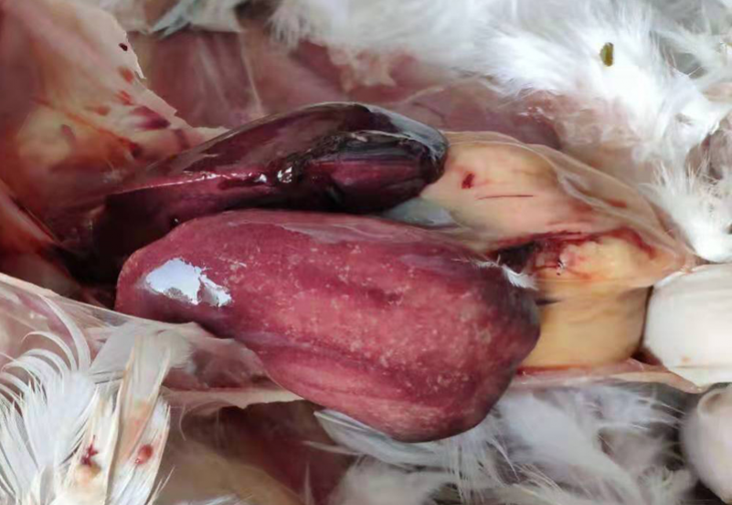 3、禽傷寒:肝臟變成淡綠棕色或古銅綠色,肝臟表面有時有灰白色米粒狀壞死點。